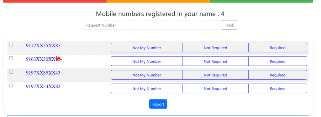 वेबसाइट में लॉगिन होने के बाद जो भी मोबाइल नंबर आपका आधार कार्ड से सक्रिय हैं सभी की लिस्ट यहां आपको देखने के लिए मिल जाएगी इस तरह से जैसे फोटो में दिख रही है यहां पर सभी मोबाइल नंबर के स्टार्टिंग के तथा आखिरी के नंबर देखने के लिए मिलेंगे जो नंबर आपका है वह आप यहां से पता कर सकते हैं और जिस नंबर को आप बंद करना चाहते हैं इस्तेमाल नहीं करते हैं उसके लिए आपको खाली box को tick करना है तथा note my number या not required पर क्लिक कर देना है और आगे आपसे कुछ जानकारी मांगी जाएगी उसको लिखकर सबमिट कर देना है। उसके बाद आपका यह नंबर बंद हो जाएगा।