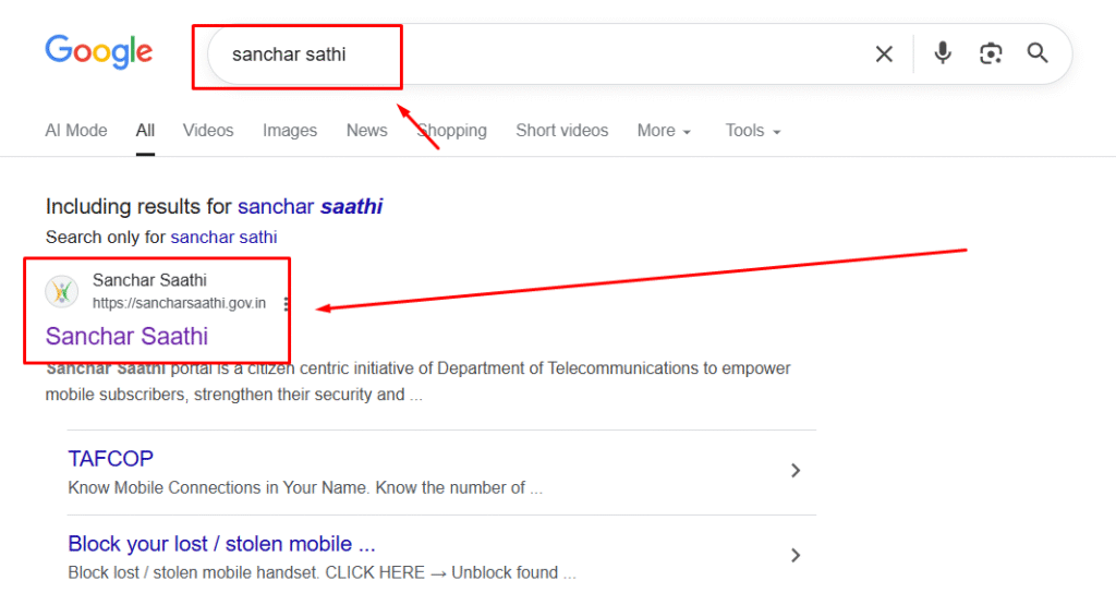 पहले स्टेप में आपको अपने कंप्यूटर में या मोबाइल में गूगल पर आना है यहां आने के बाद sanchaar Saathi लिखकर सर्च करना है सरकार की sanchaar Saathi वेबसाइट सबसे ऊपर सर्च रिजल्ट में आपको दिखाई देगी इस वेबसाइट को क्लिक करके ओपन कर ले।