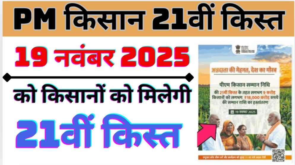 किसानों को आधिकारिक सूचना के माध्यम से यह जानकारी दी गई है! कि प्रधानमंत्री किसान सम्मान निधि योजना के तहत 21वीं किस्त का पैसा 19 नवंबर 2025 को जारी किया जाएगा! जिसमें की कुल 9 करोड़ किसानों को इस बार पीएम किसान योजना के तहत 21वीं किस्त का पैसा दिया जाएगा! आपको बता दे! Pm किसान किस्त को लेकर किसानों को लगभग 18,000 करोड रुपए की सम्मान राशि का हस्तांतरण पीएम किसान योजना के तहत किया जाएगा!